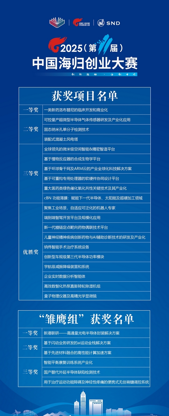 2025(第11屆)中國海歸創業大賽深入貫徹黨的二十大和中央人才工作會議精神,堅持平臺開放和機制創新,北京理工大學、南京大學首次加入聯合主辦,支持參賽人才項目與高校開展產學研深度合作。另有北京、上海、濟南、煙臺、昆山、丹陽、長沙、深圳、寧波、廈門、蘭州、呼和浩特等地20多家產業園區、科創載體協辦,全國300多家創業園區、投資機構等企事業單位和高校參與賽事,在政策、空間、資本、孵化服務等方面配置優質資源,為項目技術產業化、商業化賦能。大賽聚焦“人才+科創+產業+金融”,組建專項基金撬動社會資本給予參賽項目優先投資支持;舉辦“海創中國”英才行、產業融通對接會等專場活動,推動人才與科技創新和產業創新精準對接、深度融合,同時通過“海創中國”導師行活動和常態化機制,為參賽項目提供創業輔導和陪伴式服務。此外,為加強早期項目培育,本屆大賽對于未在國內注冊企業的參賽項目,單獨設立“雛鷹組”和相應賽制獎項,發揮中國海歸創業大賽服務基地和各方資源作用,提供定制化輔導、政策匹配及落地支持。
