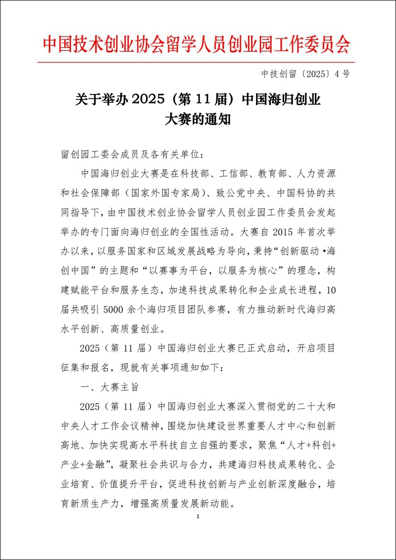 發(fā)文時間:2025-03-31 發(fā)文單位:中國技術(shù)創(chuàng)業(yè)協(xié)會留學(xué)人員創(chuàng)業(yè)園工作委員會 中技創(chuàng)留〔2025〕4號